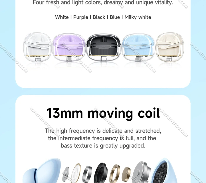 העיצוב מגיע במבחר צבעים מרהיבים – שחור, לבן, תכלת וסגול – כך שכל אחד יכול למצוא את הסגנון שמתאים לו. בזכות המשקל הקל, רק 3.8 גרם לאוזניה, הן נוחות במיוחד לשימוש יומיומי ממושך.